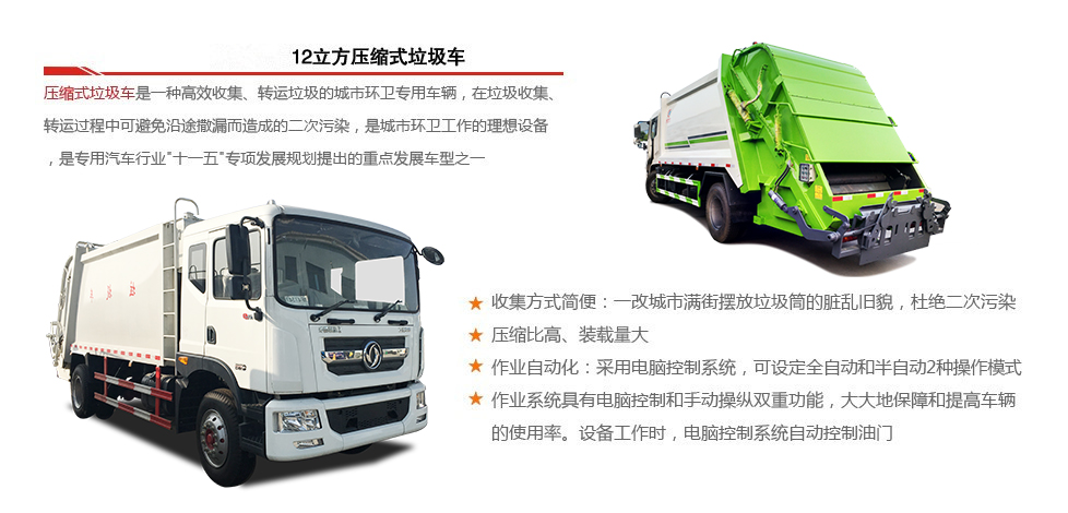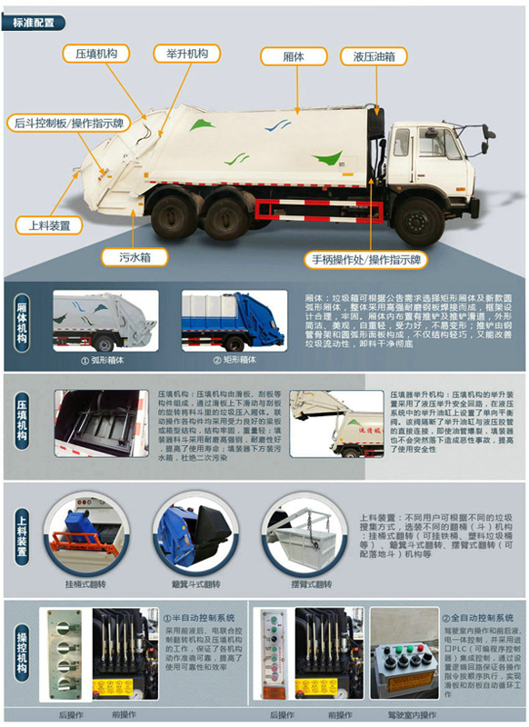 標(biāo)準(zhǔn): 壓縮式垃圾車:采用機(jī)、電、液聯(lián)動控制系統(tǒng)、電腦控制及手動操作系統(tǒng),通過填裝器和推鏟等裝置實(shí)現(xiàn)垃圾倒入、壓碎或壓扁,并將垃圾擠入車廂并壓實(shí)和推卸。