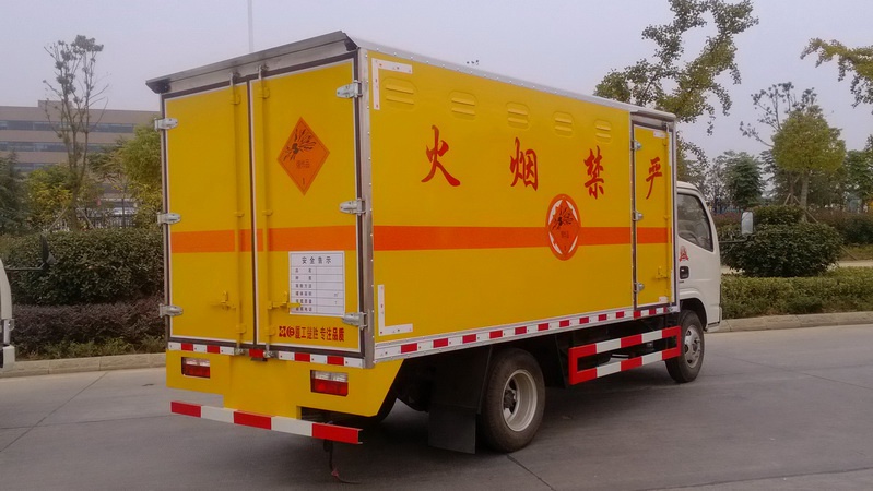 隨底盤選裝前面罩以及前霧燈,選裝右側(cè)箱體不開門,廂體頂部封閉,不可開啟:運(yùn)輸品名:黑火藥,炸藥,電引爆雷管,爆破炸藥,煙花爆竹等,類項(xiàng)號:1.1B,1.1D,1.1G,1.2G,1.3G,1.4G 等; 防護(hù)材料:Q235A碳鋼,連接方式:左右側(cè)面及后下部防護(hù)均采用焊接連接,后部防護(hù)斷面尺寸(mm):100?0,后部防護(hù)離地高度(mm):450,采用發(fā)動機(jī)型號CY4BK551,YC4FA115-50,D28D11-5DA,對應(yīng)油耗值分別為12.4;12.6;12.6。該車安裝帶有衛(wèi)星定位功能的行駛記錄儀。僅采用前盤制動器和安裝ABS以及前置消聲器的底盤。采用子午線輪胎。安裝限速裝置,限速80km/h。ABS廠家及型號:襄陽東風(fēng)隆誠機(jī)械有限責(zé)任公司/ABS/ASR-24V-4S/4M。