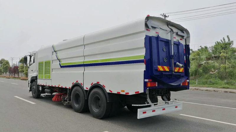 6)具備倒車保護(hù)裝置,在作業(yè)過(guò)程中如遇緊急倒車,智能化的控制系統(tǒng)會(huì)自動(dòng)停止作業(yè)并收回掃盤、吸盤和側(cè)噴桿;具有防止舉升垃圾箱翻車保護(hù);具有檢修安全保護(hù)。